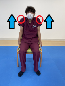 ②肩をすくめる ように上に上げて止め、力を抜いて下ろします。