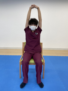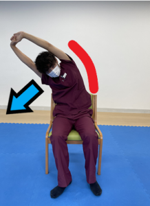 ②そのまま横に脇の方が伸びるように、腕を倒します。左右行います。
